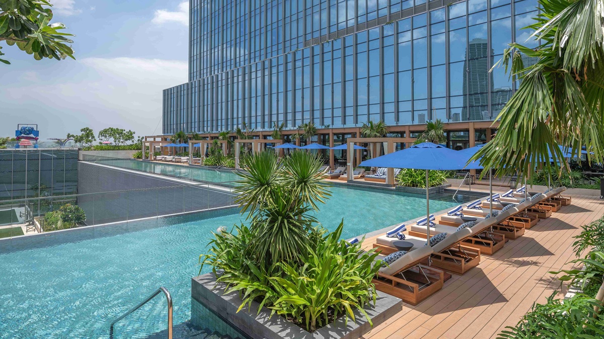 A 50-meter lap pool anchors the outdoor wellness deck, offering guests the opportunity for sunrise laps or afternoon cooldowns. Nearby, children can splash and play at the Waterpark, featuring interactive elements like water cannons, slides, and splash buckets.