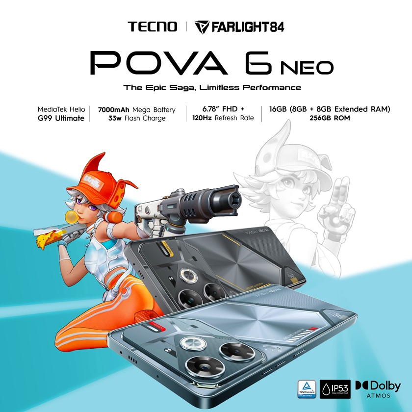 The TECNO POVA 6 NEO is available in Starry Silver, Speed Black, and Comet Green. With a robust 7000mAh battery, gamers won’t be left hanging. The POVA 6 NEO features a powerful Mediatek G99 Ultimate processor, 128GB to 256GB ROM, extended 8GB RAM, a 50MP camera with a light sensor, an 8MP front camera with dual flash, and Dolby Atmos dual speakers.
