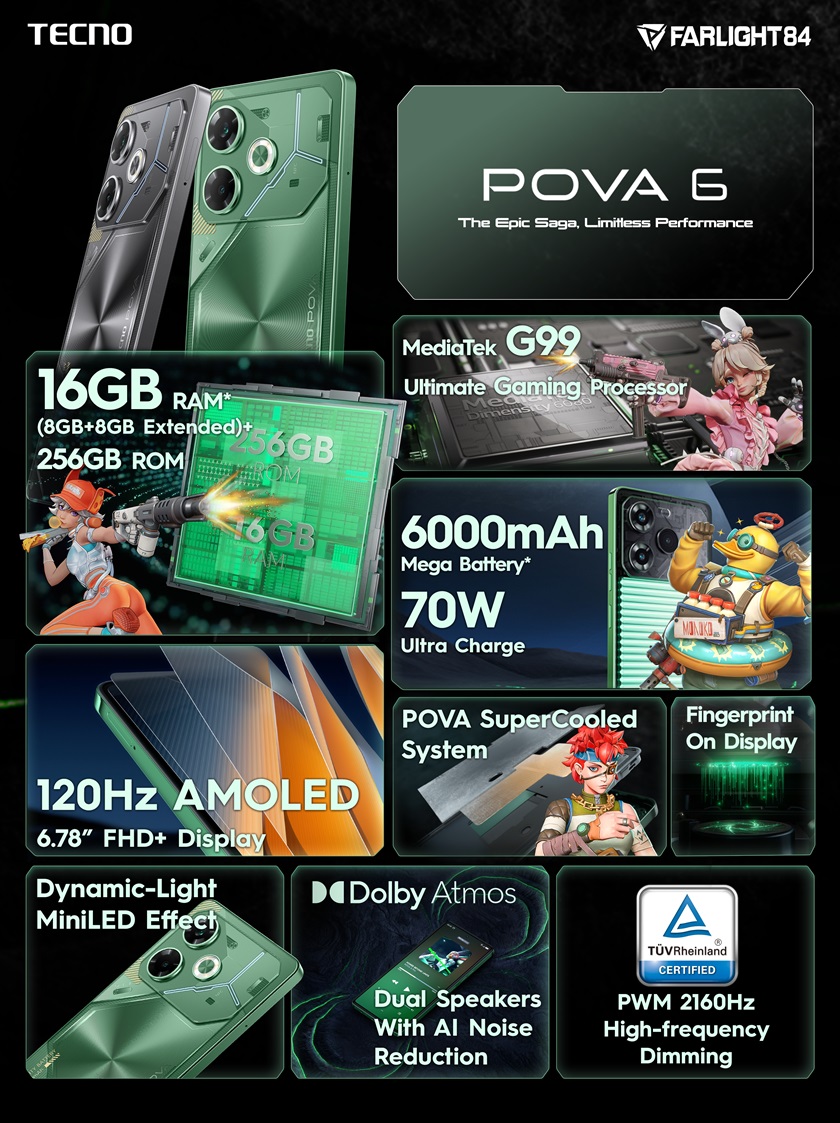 The standard retail price (SRP) for the POVA 6 NEO 8+128GB is PhP6,999, while the POVA 6 NEO 8+256GB is PhP7,999. The official price for the POVA 6 8+256GB is PhP9,999.
