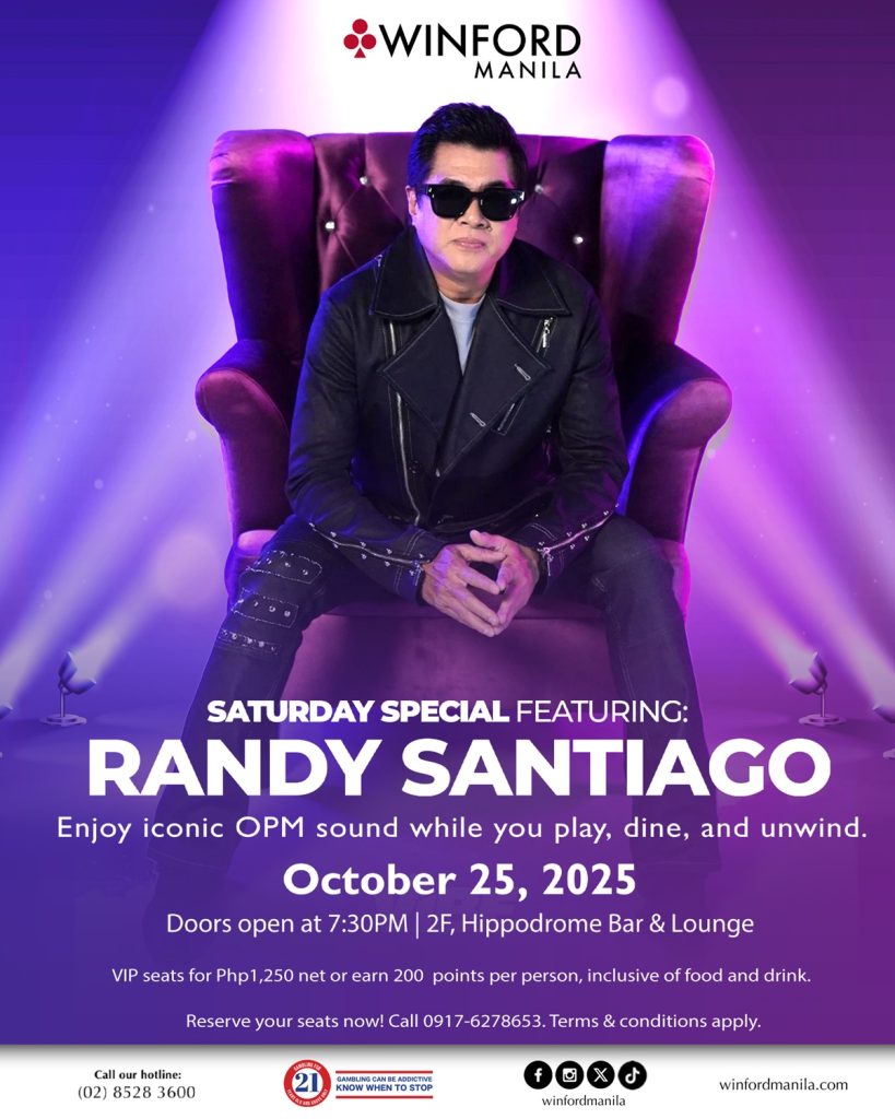 Catch OPM icon Randy Santiago with The Private Eyes Band in Winford Manila’s Saturday Special on October 25, 7:30 PM.