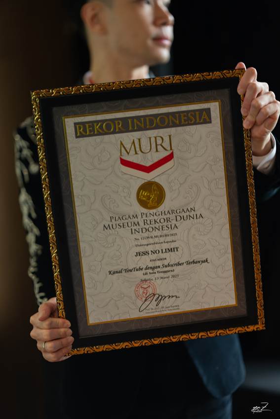 Justin holds up his MURI Award (Museum Rekor Indonesia) as the YouTube channel with the most subscribers in Southeast Asia.