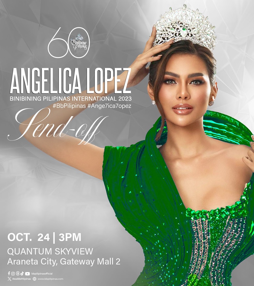 Be part of the ceremonial send-off hosted by Binibining Pilipinas Charities Inc. for Binibining Pilipinas International 2023, Angelica Lopez, as she sets her sights on bringing home the Philippines’ 7th Miss International crown at the 62nd Miss International Pageant on November 12 in Tokyo, Japan.