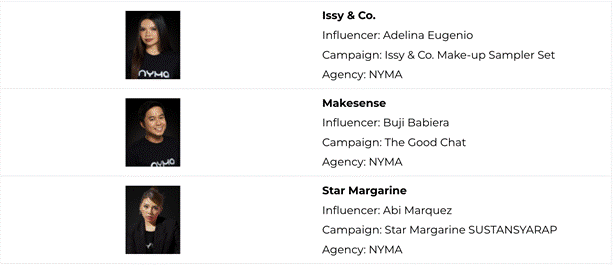 “To see our talents nominated once again is a proud moment for us,” said Kat Bautista, NYMA’s Chief Operating Officer. “Abi, Adelina, Buji, and Raco may be young, but their work already shapes conversations and challenges conventions. Each of them leads with authenticity and purpose, using their influence to forge real, lasting connections.”