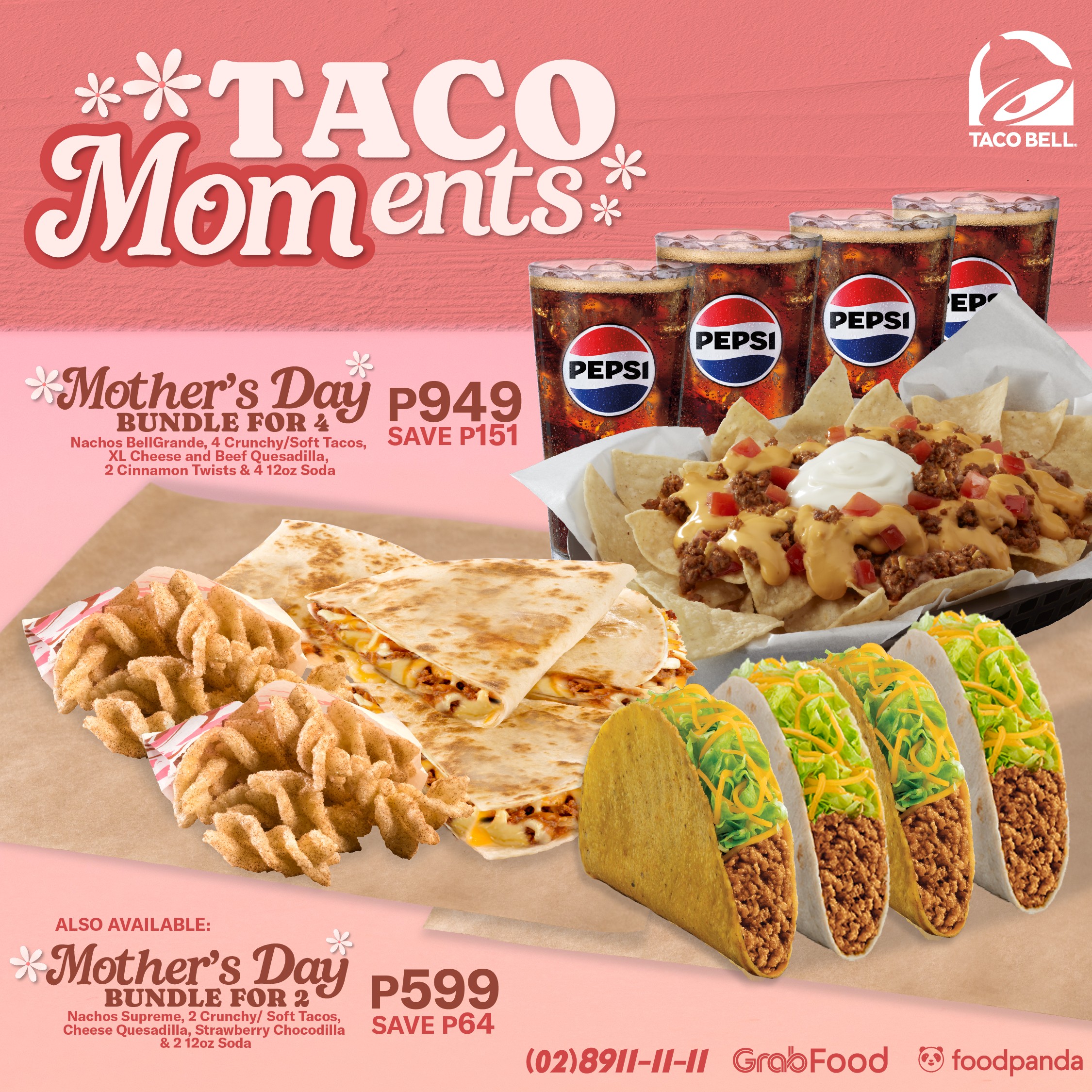 For delivery, their hotline is: 8911-1111 or via Taco Bell’s official delivery partners: GrabFood, foodpanda, and Pickaroo (prices and delivery fees may vary).