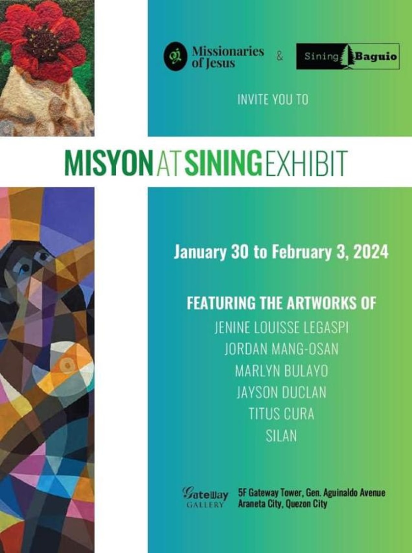 The Missionaries of Jesus warmly welcomes you to “Misyon at Sining,” a group art exhibit for a noble cause. The exhibit showcases the artworks of the talented artists from Sining Baguio: Titus Cura, Jenine Louisse Legaspi, Silan (Cynthia Duclan), Jayson Duclan, Marlyn Bulayo, and Jordan Mang-osan. Gateway Gallery, Level 5, Gateway Tower Mall Until February 3 10 AM to 6 PM